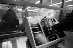 | 地铁大兴线站内新型液体安检仪检测瓶装液体 摄/记者黑克 |