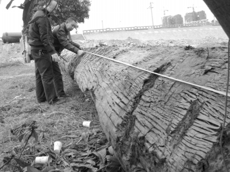 沙场里摆放着一棵灰黑色的乌木。乌木旁,几位买家正在测量乌木的长短、直径。经测量,整根乌木总长近20米,树根部位直径1米。虽树身表层已经碳化,但剥开碳化层,里面木质纹路清晰仍很坚硬。