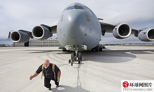 一名男子在加拿大安大略湖军事基地靠身体力量拖动一架重188.83吨的CC-177环球霸王运输机,成为全球拖动最重飞机的人。