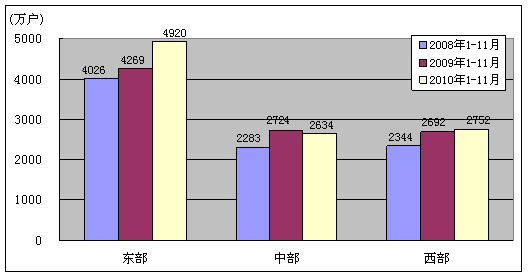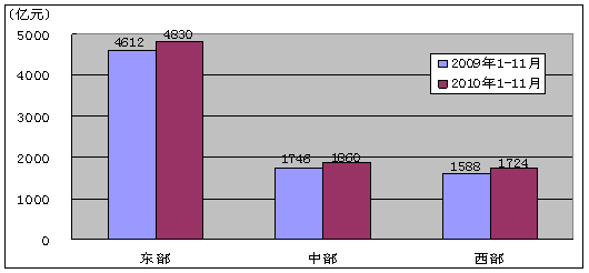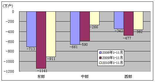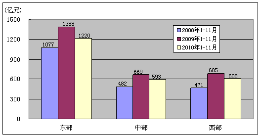 2010年1-11月,东、中、西部地区电信固定资产投资比上年同期分别下降12.1%、11.4%、11.3%。