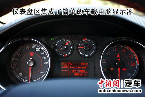 仪表盘采用运动轿车最为普及的桶式表台,外侧桶圈采用电镀材质提高档次。仪表盘区集成了简单的车载电脑显示器,可显示当前时间,车外温度等,最有趣的可以显示涡轮工作的状态,使驾驶者可以真真切切的体验到精确操控视觉化的乐趣。仪表盘背光延续了菲亚特的橙色。