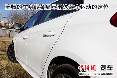 从侧面看,博悦拥有流畅紧凑的车身线条,前机盖的双抛物线、突出的轮眉、前低后高的腰线、17英寸碳色配银边的双色双五辐轮毂很都显示出了这款车运动的定位。