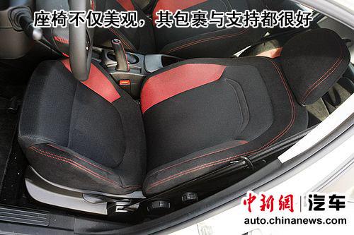 层次分明的中控台朝向驾驶员一侧,中控台上部是音响控制区域,下层为空调控制区域,两侧则排列着中控门锁、前大灯高度调节以及运动模式等按钮。按键旋钮大而清晰,不容易误操作,同时触感和材质都令人满意。真皮包裹的三幅多功能方向盘,加上了握手位,并用红线缝制迎合运动主题,手感表现很好。