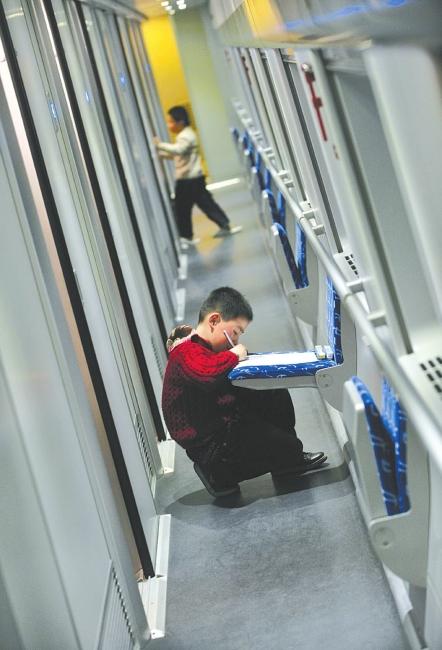 一小乘客在过道上写字