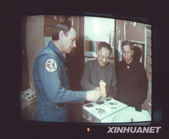 1979年2月2日,美国休斯敦的电视上播出邓小平(中)在该市约翰逊航天中心参观的画面。来源:新华社