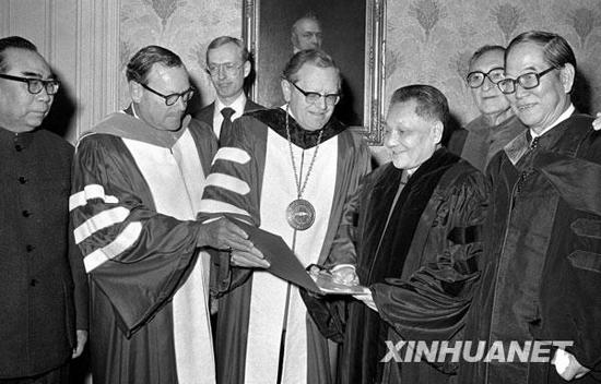 1979年1月31日,邓小平(右三)在美国华盛顿接受美国费城坦普尔大学名誉法律博士学位。来源:新华社