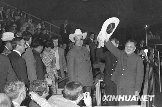 1979年2月2日,邓小平在休斯敦观看马术竞技表演时挥动牛仔帽,向观众致意。来源:新华社