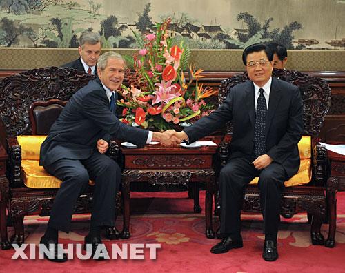 2008年,8月10日,中国国家主席胡锦涛在北京中南海瀛台会见并宴请前来参加北京奥运会开幕式和相关活动的美国总统布什。来源:新华社