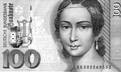 1996年,克拉拉·舒曼(1819—1896)出现在100元面值的德国马克上。克拉拉是位钢琴家,21岁时嫁给音乐家罗伯特·舒曼。婚后夫唱妇随,舒曼每谱一支曲子,都与克拉拉反复商讨。随着舒曼名声渐起,克拉拉将全部精力投入到丈夫的事业上,自己渐渐被外界淡忘。