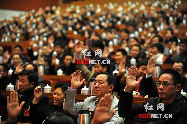 省政协委员举手表决,通过多项决议。