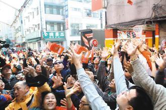 大年初四,台北市某投注站迎完财神后,撒出总值10万元新台币的五百个红包,引发民众争抢。 来源:台湾《联合报》