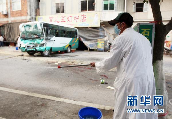 2月10日,防疫人员在事故现场喷洒消毒药水。当日14时14分许,广东省廉江市石角镇境内发生连环交通事故,一辆大货车沿廉石线向广西方向行驶至廉江市石角圩桥头后失控,分别碰撞7辆二轮摩托车、1辆中型客车及1辆小货车,并撞向附近居民房屋,肇事司机肇事后逃逸,公安机关正在组织追捕。事故共造成7人死亡,8人不同程度受伤,其中2人伤情较重,伤者已被送往医院救治,目前伤情稳定。新华社发(李忠 摄)