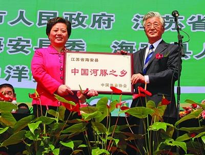 上图:中国渔业协会会长齐景发(右)将国内唯一一块“中国河豚之乡”的匾牌授予了海安县长单晓鸣(左)。
