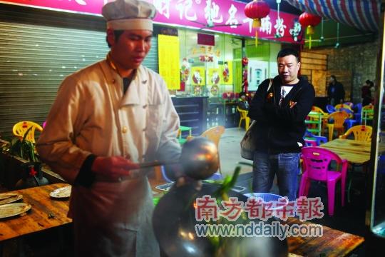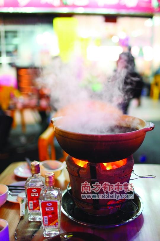 一个小摊档,露天摆放着数十张桌椅,一盏明亮的灯一方切肉的案台极为惹眼,财记陈师傅羊肉煲用地道的市井手法,大鸣大放,粗狂直爽。“爆炒羊肉不可少的就是蒜苗。”鲍汁飞说,蒜苗的香味透过火候的把握浸入羊肉,先炒后煲的羊肉更显美味。师傅爆炒的手艺尽收眼底,诱人的羊肉倒入砂锅。鲍汁飞提醒说,接下来需要的是等待。“吃羊肉煲不能急,焖上一小时后的羊肉才是真正享受,因为吃羊肉就要一种‘淋’劲。”等待美味的时间虽长,不过围炉小聚也不失为另一种享受。