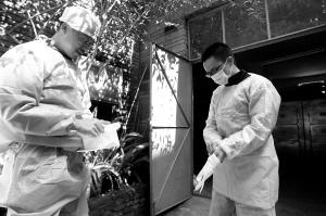 ▲法医朱伟和实习生方强解剖前穿防护服