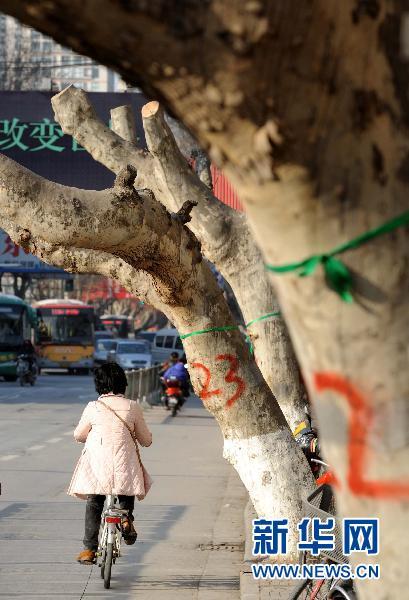 南京太平南路一地铁施工点附近的一排梧桐“修整”后留下树干,树身上喷涂了迁移编号(3月17日摄)。近日,由黄健翔、孟非、陆川等多位知名人士通过微博发动“拯救南京梧桐树”活动,媒体随后跟踪报道,将南京因修建地铁移植梧桐树事件推到了舆论的风口浪尖。一场“拯救南京梧桐树 筑起绿色长城”活动正在展开,不少南京市民走上街头,为树木系上了绿丝带,表达自己的不舍和反对。南京市政府正面回应,表示愿意公开征集民意,进一步优化建设方案。新华社记者孙参摄
