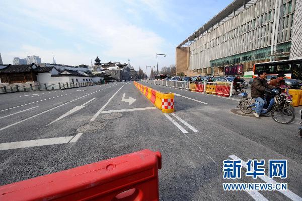 在南京图书馆附近的太平北路上,原先种有一排排梧桐树的地方已被平整成路面(3月17日摄)。新华社记者孙参摄