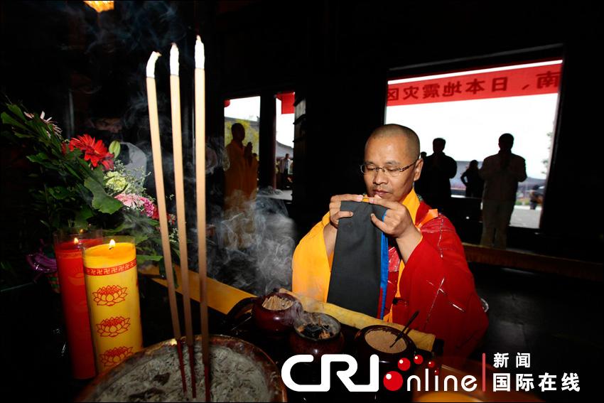 2011年3月19日,海南三亚,三亚佛教界在南山寺为云南盈江、日本地震灾区举行超荐祈福法会。南山寺全体僧众与南山景区工作人员及三亚地区的居士等佛教四众弟子数百人,共同为云南盈江及日本特大地震及次生灾害中的遇难者祈祷回向。CFP