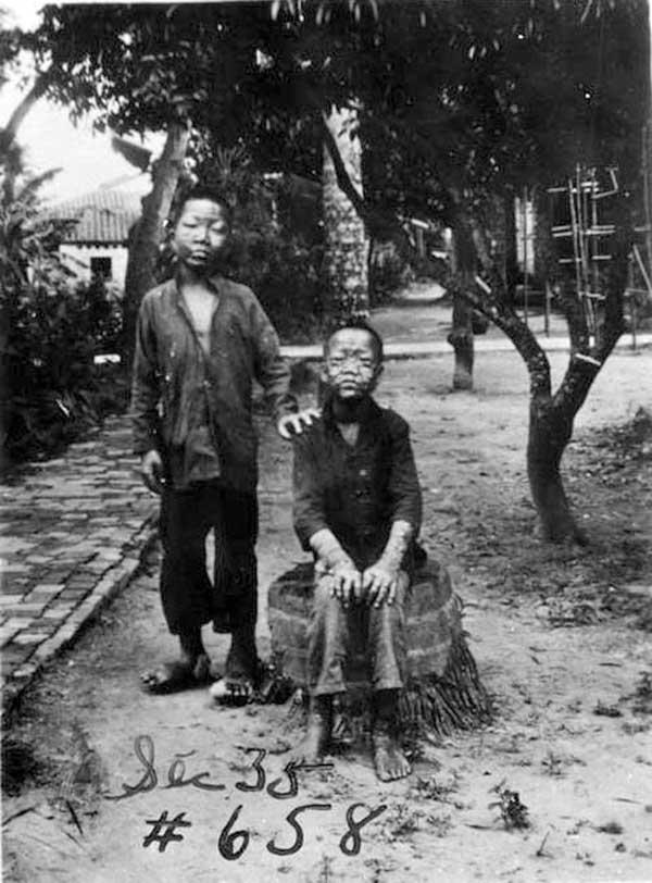 广东江门,麻风病院内,12岁和70岁的麻风病患者(1934年)。