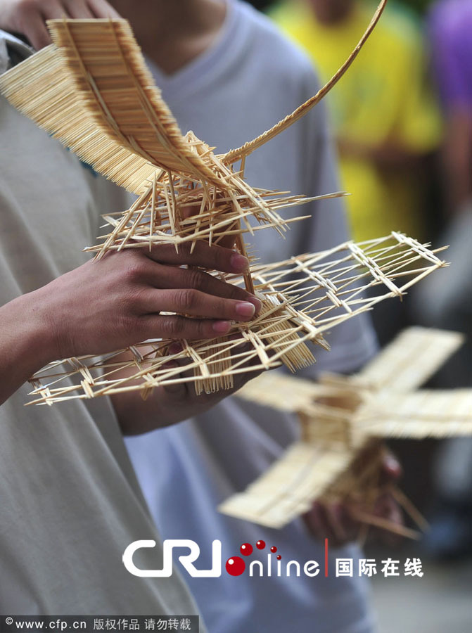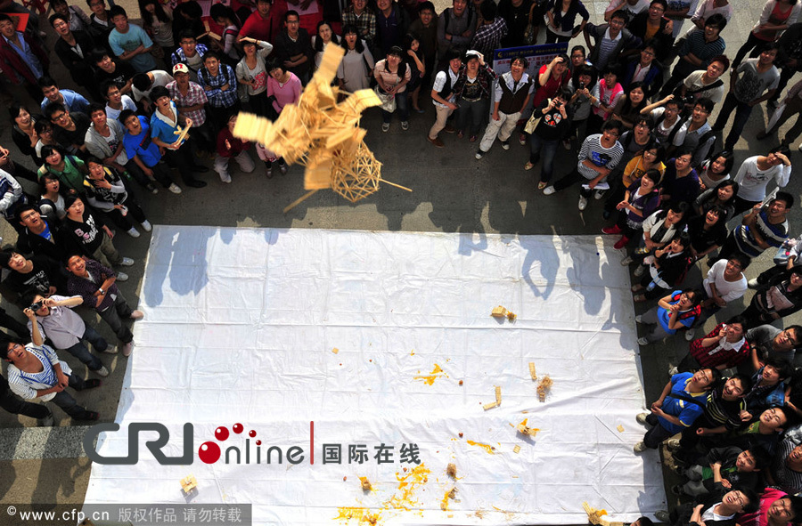 国际在线消息:2011年4月23日,武汉理工大学土建学院举行一年一度的“高空护蛋”比赛,向人们证明生鸡蛋从十七层楼的高空掉落,可以完好无损。学生们在完善设计的各样“护蛋”装置。