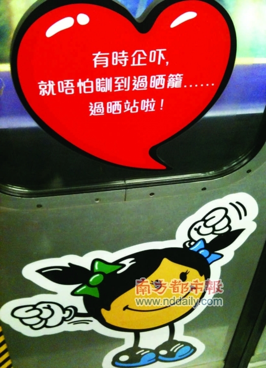 香港地铁的拥挤度是全球有名的,超过6城的市民出行都需要地下轨道交通。相对深圳地铁标语式的温馨提示,在港铁里的漫画式提点更会让人会心一笑,从中得到启发。这个系列的宣传画其实是提醒市民在地铁里要让座给有需要的人士。它通过幽默的语言以及有趣的卡通形象去表达这方面的内容,让乘客在无聊的搭地铁过程中产生出趣味来,而且口语化的文字让不少外来者感受到广东话的魅力。