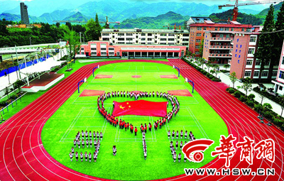 昨日,宁强县南街小学开展“感恩伴我成长”纪念5·12三周年主题活动。在新建的操场上,219名小学生围绕一面巨型国旗排列成“心”形和“5·12”数字,感谢对校园灾后重建奉献爱心的各界人士。如今这所山区小学有天津市900余万元援建的新教学楼,还有新修的塑胶跑道、现代化的电教设备、学校电视台等,几乎和大城市的学校没有什么区别。本报记者邓小卫 摄影报道