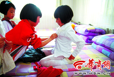 5月10日,宁强县南街小学,7岁的李媛媛换衣服时,有个扣子扣不上,小姐妹上前帮忙