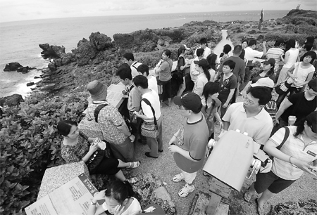 大陆游客“赴台自由行”即将试点试行,预计赴台的大陆旅客今年突破200万人次。图为2008年7月7日,“大陆居民赴台游首发团”游客在台湾猫鼻头景区参观游览。