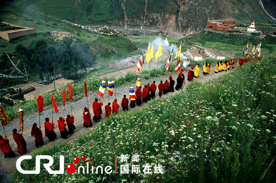 迎请上师的僧人队伍缓缓走出寺院 特约摄影师:李沪