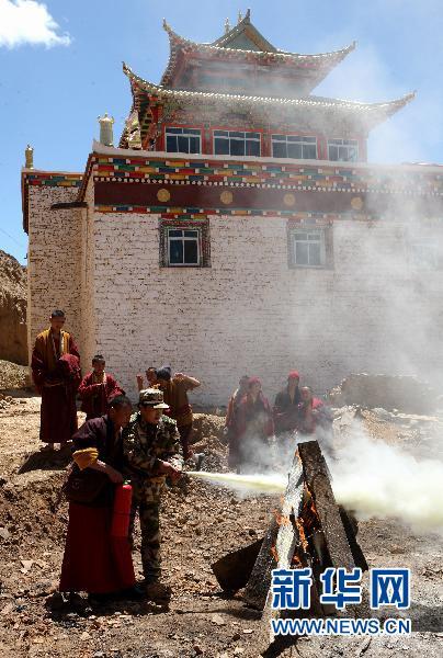 5月8日,却吉尼玛在炉霍县热哈寺被烧毁的小经殿废墟上,教授喇嘛使用灭火器。热哈寺是一所新建寺庙,去年遭遇火灾烧毁了小经殿,幸亏却吉尼玛带领的消防队员及时赶到,才没有殃及大经殿等其他建筑,寺庙对此非常感激。却吉尼玛抓住这个机会向僧侣们宣传消防知识,商讨如何完善寺庙的消防设施。 新华社记者 金立旺 摄
