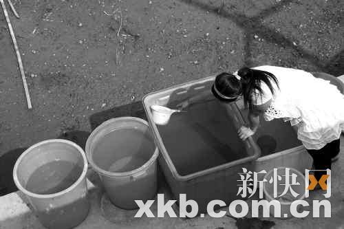 ■一位渔民正在取用明矾沉淀下来的泥水,旱灾后,他们就用这些水作为生活用水。