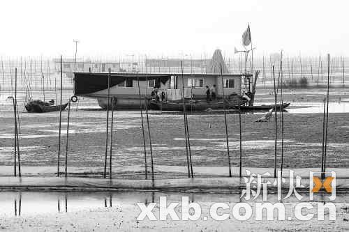 ■洪湖官墩渔场内,干涸的湖床上,渔民的家--石船随处可见。新快报记者 孟祝斌/摄