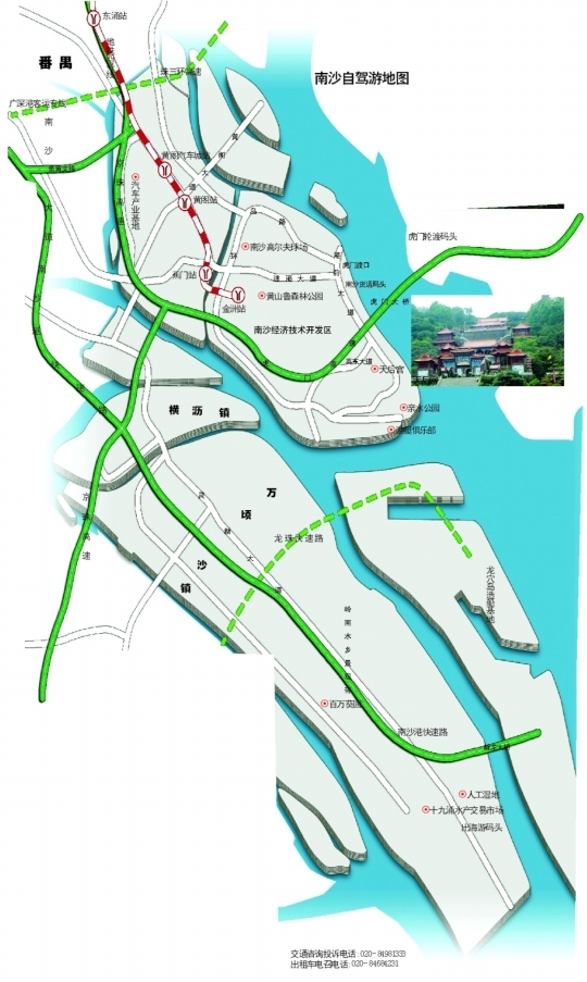 经过区政府的初步规划,目前的南沙已经初步形成了三大旅游区域,分别为:包括天后宫、亲水公园以及正在建设的游艇会在内的东部滨海旅游风景区;湿地公园、百万葵园、十九涌渔人码头在内的南部水乡生态旅游风景区;以及以丰田汽车城、南沙港码头为中心的北部现代工业景区等三大旅游板块。