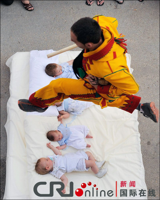 2011年6月26日,西班牙布尔格斯举行基督圣体节,成年男人经过婴儿家长同意,从婴儿身上跳过去,目的是试图扫除婴儿身上的邪恶。CFP
