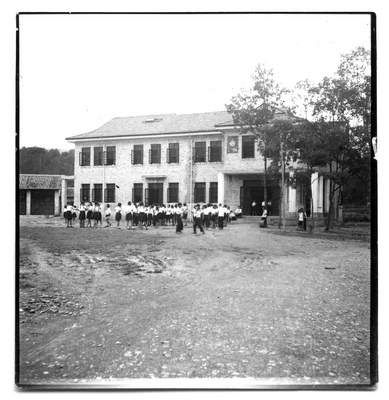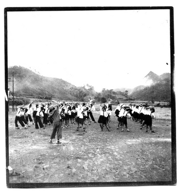 在韶山旅行期间,少先队员每天集体做晨操。