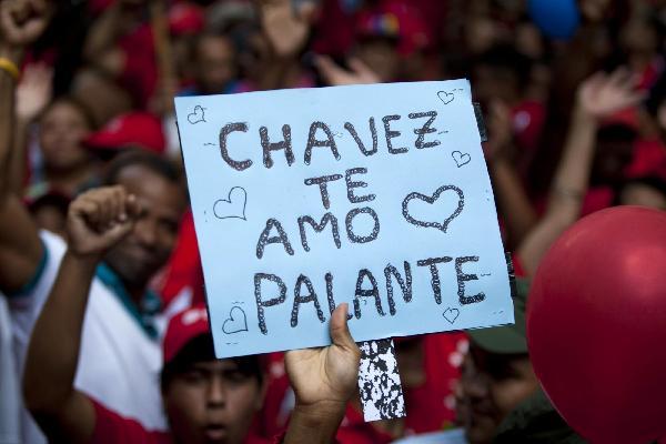 2011年7月3日,在委内瑞拉首都加拉加斯,总统查韦斯的一名支持者手持一条写有“查韦斯,我爱你!前进!”的标语参加集会。
