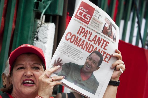 2011年7月1日,在委内瑞拉首都加拉加斯,总统查韦斯的一名支持者手拿一张印有查韦斯照片的报纸参加游行。