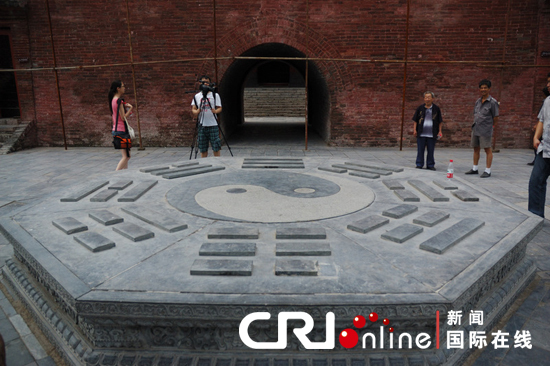 “先天八卦坛”。青砖垒砌,为直壁式等边八角形,径4.45米,高0.74米,周有青石压条。坛面以青砖砌先天八卦图,卦序为乾(三三)、兑 (三三)、离(三三)、震(三三)、巽(三二)、坎(三三)、艮(三三)、坤(三三)。中为一八角形凹槽,上原有一尊“龙马负图”,俗称“四不象”。据传,这四不象为古代一个精通八卦的高道所立。