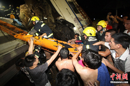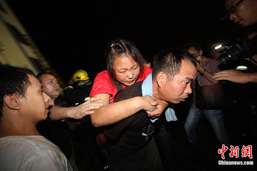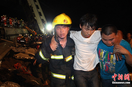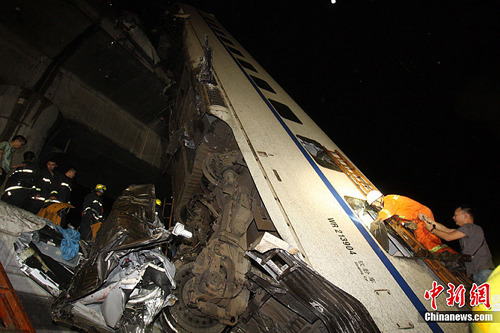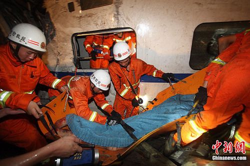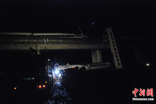 7月23日,从铁道部获悉,23日20时50分,杭深线永嘉至温州南间,北京南至福州D301次列车与杭州至福州南D3115次列车发生追尾事故。D301次列车第1至4位脱线,D3115次列车第15、16位脱线。记者从事故现场方面获悉,目前事故已造成32人遇难。中新社发 小刀 摄