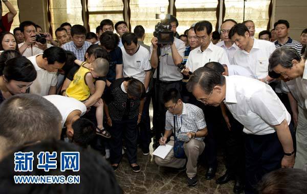 这是温家宝在金球国豪酒店看望部分死伤人员家属,向家属深深鞠躬,表示深切慰问。新华社记者 黄敬文 摄