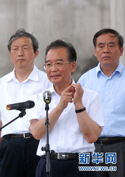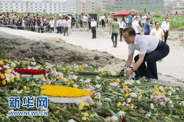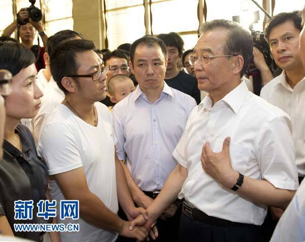 7月28日,中国国务院总理温家宝在温州察看“7·23”甬温线特别重大铁路交通事故现场,悼念遇难者,看望受伤人员,对伤亡人员家属表示深切慰问,并回答中外媒体记者的提问。新华社记者 黄宗治 摄