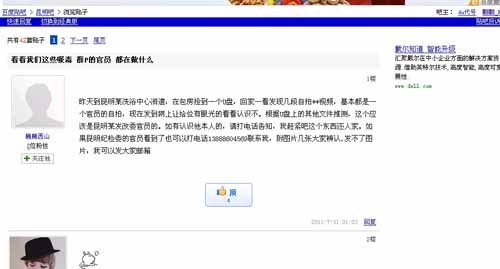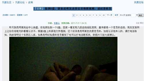 “东泰山”自7月31日零时31分开始,一共发了4条帖子。零时31分发布《看看这个荒淫的河南汝阳人大主任 》,零时47分重发《看看这个荒淫的河南汝阳人大主任》;1时14分发布《看看我们这些吸毒 群P的官员 都在做什么》,10分钟后又重发《看看我们这些吸毒 群P的官员都在做什么》。而最为轰动的《云南捡到U盘,疑似昆明发改委官员艳照视频,请纪委收货访》一贴,同《与看看我们这些吸毒 群P的官员都在做什么》内容完全一致,只是标题不同。