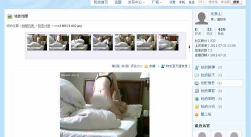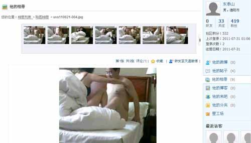 射向汝阳那颗“炮弹”,是以“下岗女工”的名义做的控诉,除了故事性很强,控诉者声泪俱下外,最勾人眼球的莫过于一组9张清晰度很高的“床照”,尤其是男主角面部极为清晰,连图中男子“完事”后满足的细微表情都被捕捉了下来。但从画面来看,应该属于偷拍,尽管位置选择极佳,但依旧留下了偷拍痕迹。尤其是女主角——“下岗女工”在图片中位置极其讲究,都避开了摄入面部镜头的角度,在挑出来的放入相册的9张照片中,均属面部不明一类,甘作男主角的“配衬”。而“下岗女工”在贴文中却控诉说,“把他自拍的荒淫视频公布出来”,似乎又是暗示此组图片为视频截图。倘若如此,摄像器材应该为高清格式,而且是在光线状况极好的情况下进行拍摄的。