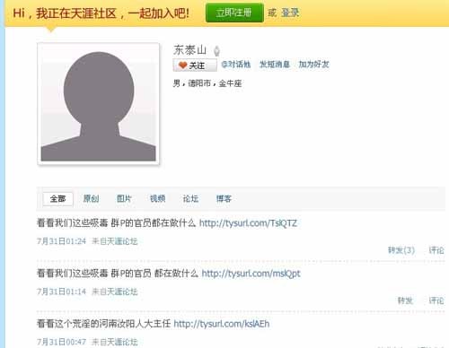 其实,“东泰山”刚在“天涯社区”上活动,其反常的举动就被一些网民注意到了,并对其行为提出了质疑。