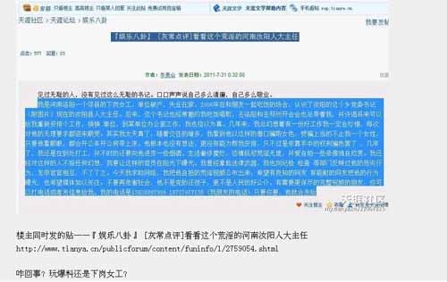 网友“涅复生”就曾指出,楼主同时发的贴——『娱乐八卦』 [灰常点评]看看这个荒淫的河南汝阳人大主任(此贴已被删)咋回事?玩爆料还是下岗女工?