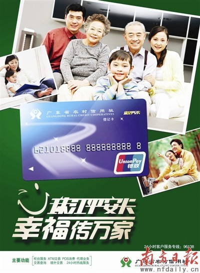 2007年底,省联社加入银联,在全省范围发行统一品牌借记卡——珠江平安卡,并相继推出了手机银行、网银、支付宝卡通等全新的业务品牌。截至2011年6月末,全省共发行珠江平安卡1219.7万张,吸收卡内存款365亿元,布设ATM机具6104台,累计签约银联POS商户3.7万家,支付宝卡通开户数达15271户。目前,全省已上线农信社(农商行)网银开户数达6.5万户,其中个人网银6.06万户,企业网银3700多户。近期,省联社又积极与中国银联合作,在全省推出了“珠江平安福农卡”,大大缓解了农民融资难、贷款难和支付不便的问题,使广大农民获得了更多实惠。