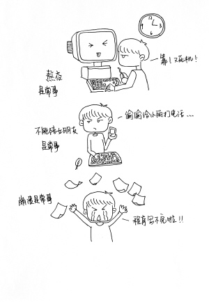 她作画,全然没有大师范儿。一张桌子(有时甚至在床上),一本廉价的白纸,一支碳素笔(有时候这支笔还得用来写论文草稿,悲催吧!),加上一脑子的胡思乱想就可以开始作画。她作画不是想到哪画到哪,而是先构思个5分钟,然后再下手。所有配文都经过深思熟虑,非常经典。
