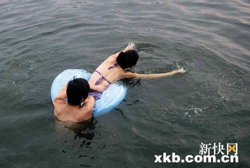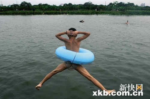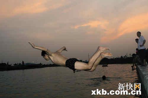 美女穿蓝花比基尼打底,连衣裙一脱,扎起长发,石阶上小跃,入水。大小男子汉,三角裤衩,红的、黑的、CK的,当然还有光着屁股的。每天下午四五点到傍晚时分,这个“野泳场”光顾着100多人的消暑大军。