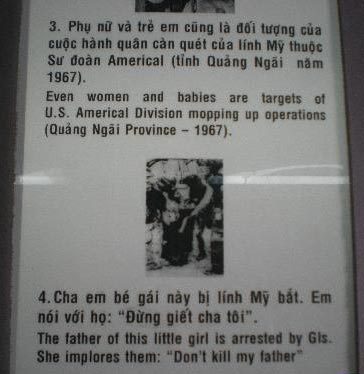 整个展览通过武器、战地照片、受害者战后生活图片及儿童绘画,并配以冷静的叙事性文字,来描述越战期间美军如何以先进武器、不人道手法来杀害越南人,如松美村大屠杀事件、越战中美军的军各种破坏行为和暴行,再现出惨绝人寰的“战争罪行”。极具讽刺的是,这些描述美军暴行的图片绝大多数是来自美国。