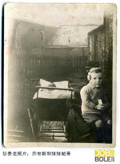 这张泛黄的老照片是小乔布斯和妹妹帕蒂在“乔家小院”的合影。3岁多的小乔布斯头戴耳机,手捧“iPod原型机”,胯下“小板凳”。